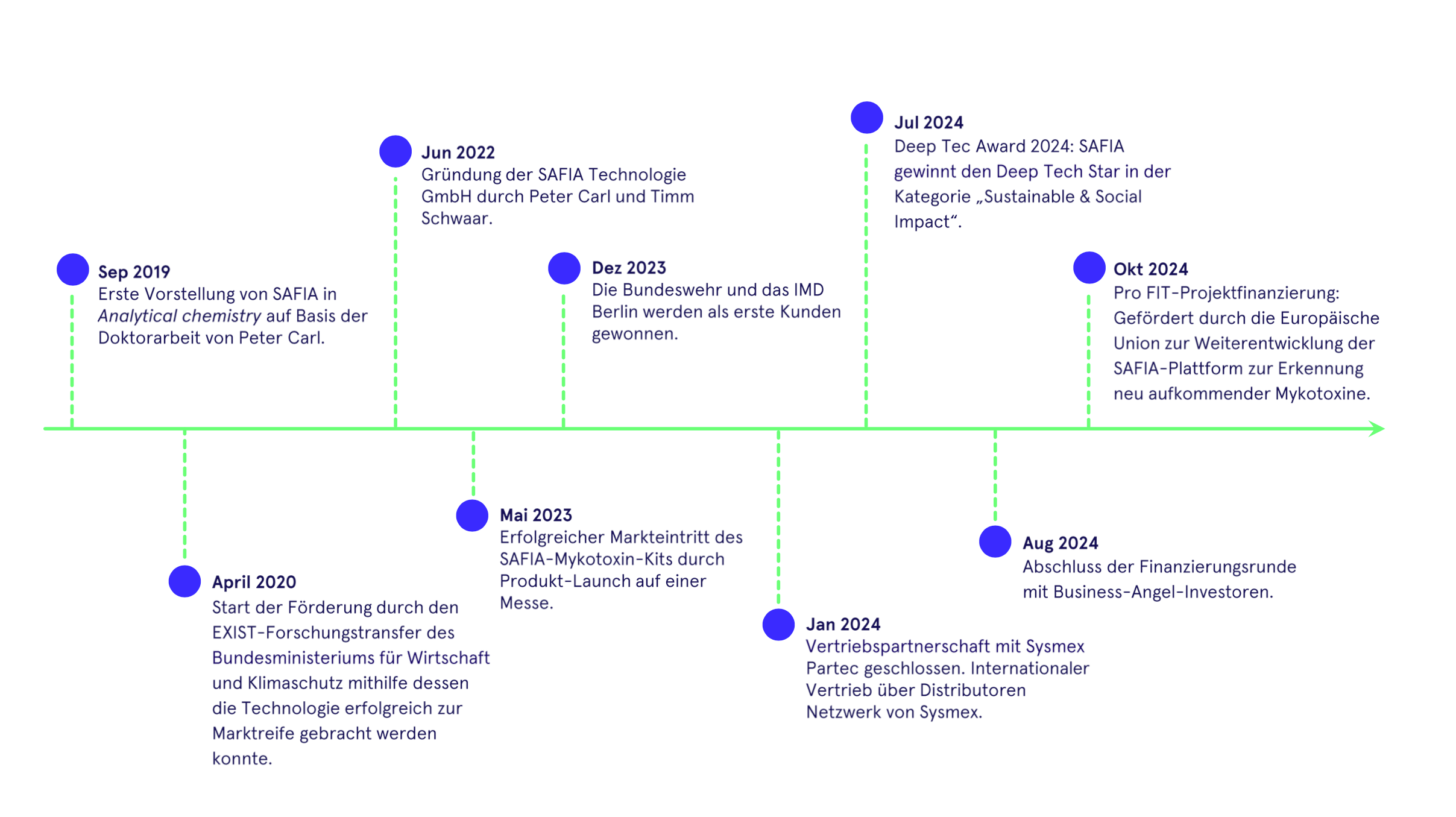 Mit präzisen und nachhaltigen Technologien begegnen wir den drängendsten Herausforderungen der Lebensmittelsicherheit. Laut der Ernährungs- und Landwirtschaftsorganisation der Vereinten Nationen (FAO) sind bis zu 25 % der Lebensmittel weltweit mit Mykotoxinen belastet. Ein Problem, das sich mit dem voranschreitenden Klimawandel massiv verschärfen wird. Diese Schimmelpilzgifte können schwerwiegende gesundheitliche Folgen haben. Mit unserem Schnelltestsystem bieten wir eine zuverlässige Lösung, um solche Kontaminanten präzise und effizient zu identifizieren. Die bahnbrechende SAFIA-Technologie wurde 2024 mit dem DeepTech Award in der Kategorie 'Sustainability and Social Impact' ausgezeichnet - ein Beleg für unsere führende Rolle in der Entwicklung nachhaltiger Analyseverfahren.